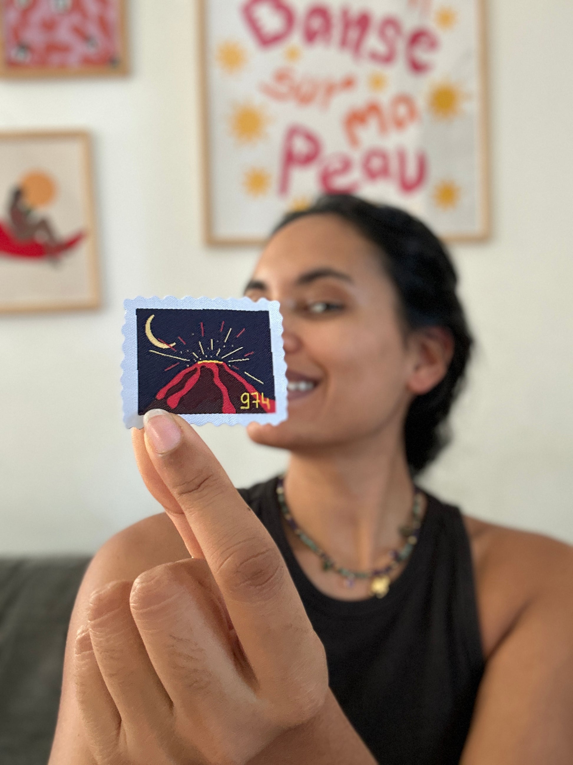 Ce patch thermocollant Timbre Volcan revisite l’imaginaire postal avec un clin d’œil à notre île en éruption permanente.