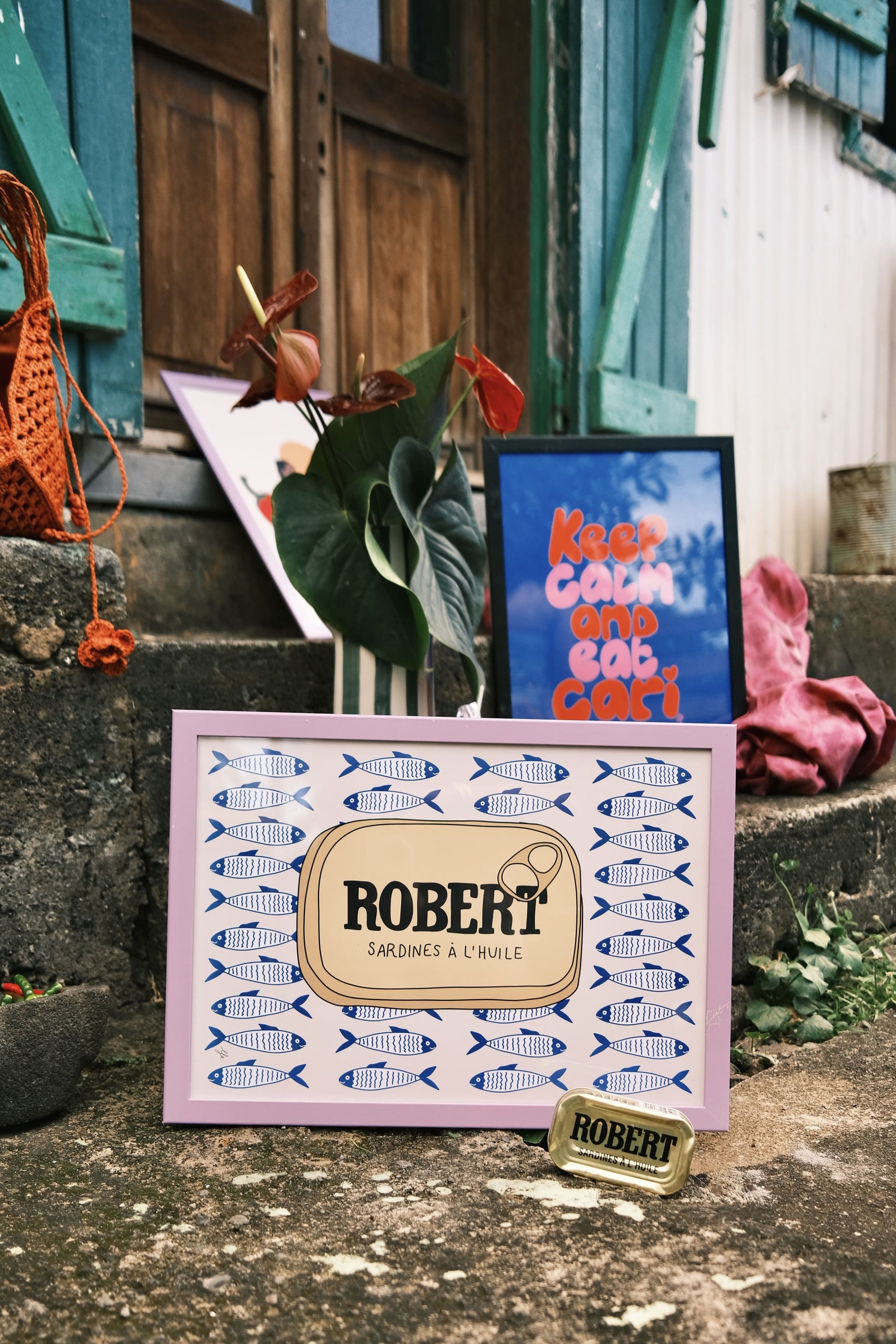 Une affiche pour de la célèbre boîte à Sardine Robert qu'on retrouve dans la plupart des cuisines créoles à l'île de la Réunion. Pour un bon casse croute ou lors des périodes cycloniques, cette fameuse boîte de sardine fait des heureux !